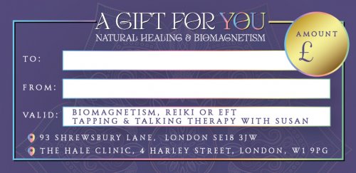 This voucher enables the recipient to experience a one hour Biomagnetism, Reiki, Reflexology, EFT Tapping Session or fusion session at The Hale Clinic in Harley Street, Central London W1 with Susan.